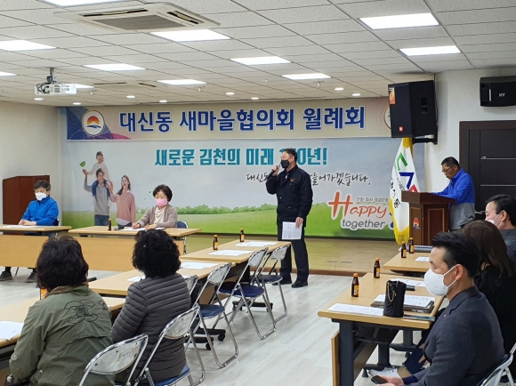 | 김천시 대신동 새마을협의회는 지난 4월 14일 대신동 행정복지센터 2층 회의실에서 전제등 대신동장, 이군호 새마을지도자협의회장 및 김기분 새마을부녀회장 등이 참석한 가운데 코로나19 방역수칙을 준수하며 2021년 두번째 대면회의를 개최했다.