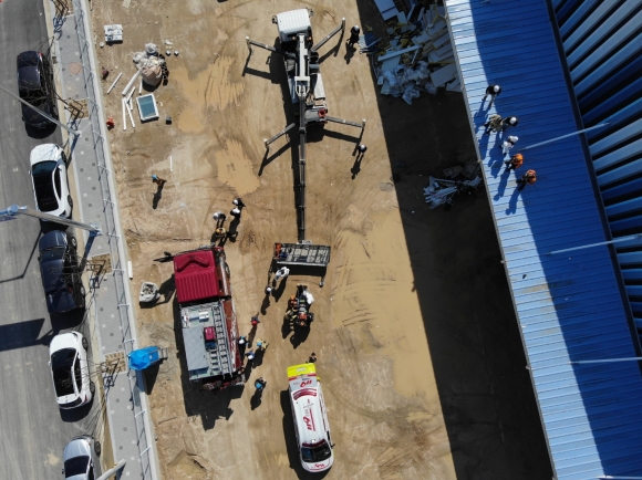 사고 장소가 지붕인 만큼 아래에서는 사고 상황을 자세히 알 수 없어 안전한 구조를 위해 소방 드론을 이용, 소방차량이 신속하고 적절한 위치에 배치되어 구조대원이 투입될 수 있었다.