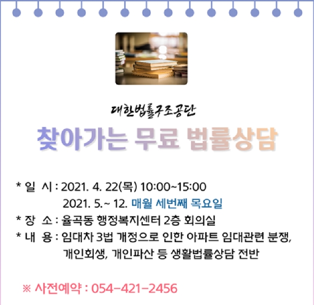 | 김천시 율곡동(동장 이우문)은 오는 22일 10시 율곡동 행정복지센터 2층에서‘찾아가는 무료법률상담 서비스’를 시행한다고 밝혔다.