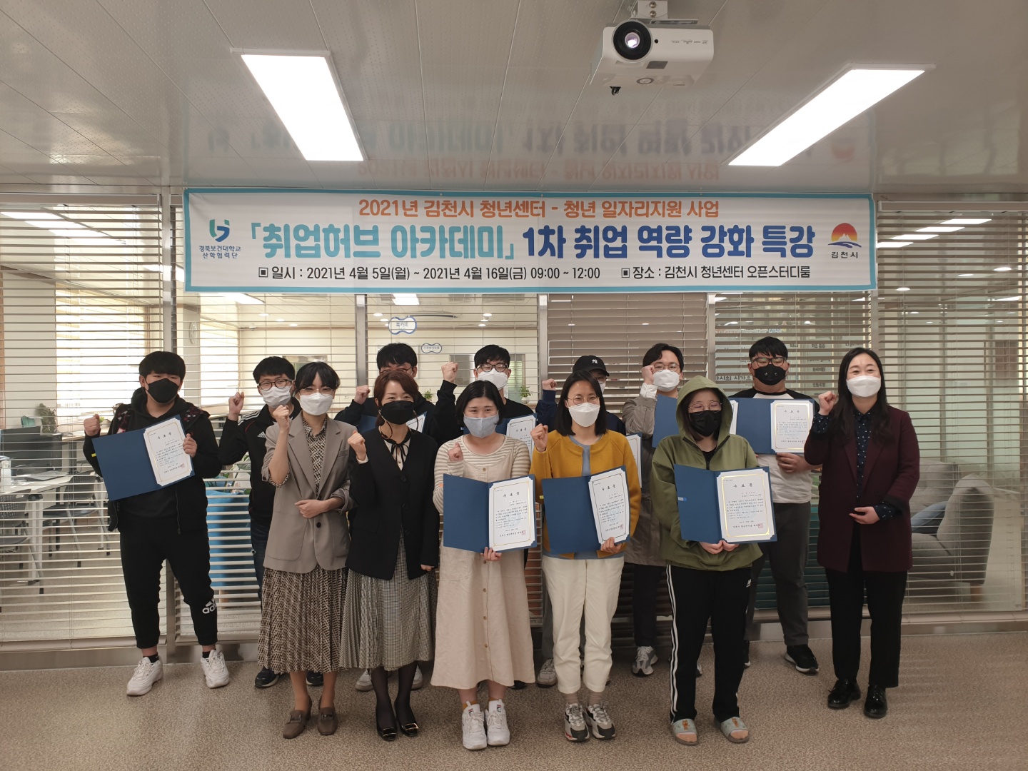 | 경북보건대학교(총장 이은직) 산학협력단이 운영하는 김천시 청년센터는 16일(금) 김천시 청년들을 대상으로 취업허브아카데미 제 1차 교육 수료식을 진행하여 10명의 수료생을 배출하였다고 밝혔다. 지난해부터 진행해 온 취업허브아카데미는 수강생들의 호응 및 만족도가 특히 높은 특강으로 4월 5일부터 16일까지 10일간 4차 산업혁명을 기반으로 급변하는 채용시장에 대한 이해와 취업 역량 강화를 목적으로 마련되었다.이번 교육은 ▲기업분석 ▲AI면접 유형 분석 및 AI면접 스피치 ▲보이스 메이킹 ▲입사서류 작성법 ▲공기업특강 등으로 구성되어 구직의욕 고취, 직무 역량 강화를 위한 과정을 운영했으며, AI면접체험은 2021년 달라진 채용트렌트를 학습하여 변화하는 채용시장에 민첩하게 대응할 수 있도록 도움이 될 수 있게 구성되었다.