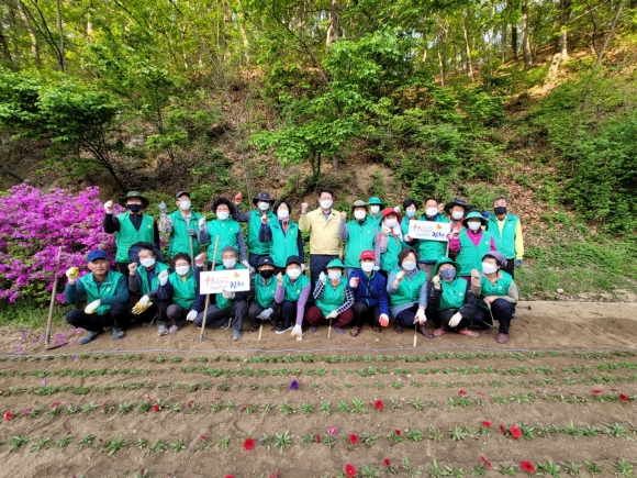 이날 회원들은 이른 아침부터 괘방령 충북경계 화단에 모여 괘방령 연도변에 메리골드 1,400본과 페츄니아 1,900본을 식재하였다.