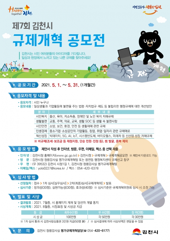 | 김천시(시장 김충섭)는 오는 5월 1일부터 5월 31일까지 1개월간 「제7회 김천시 규제개혁 공모전」을 진행한다.