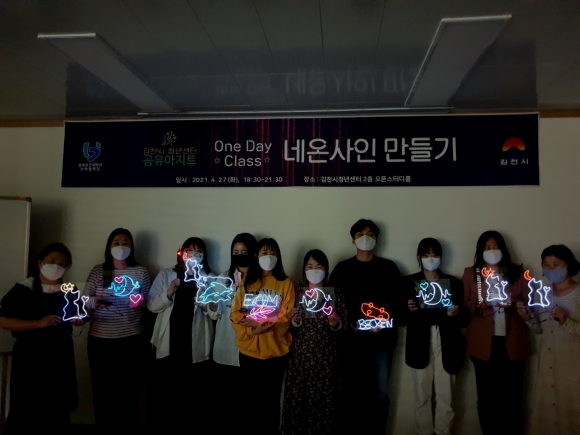 | 김천시가 지원하고 경북보건대학교(총장 이은직) 산학협력단이 위탁 운영하는 김천시 청년센터는 지난 4월 27일 네온사인 만들기 원데이 클래스 수업을 통해 공예에 흠뻑 빠질 수 있는 시간을 마련했다.