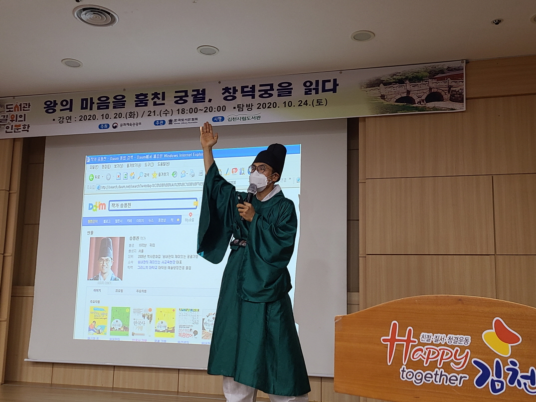 | 김천시(시장 김충섭)가 문화체육관광부가 주최하고 한국도서관협회가 주관하는 도서관 ‘길 위의 인문학’ 공모사업에 7년 연속으로 선정되었다고 밝혔다. 올해 김천시립도서관에서는 ‘시민 모두가 행복한 김천’을 만드는 디딤돌이 되고자 ‘전통이 살아 숨쉬는 우리의 멋’이라는 주제로 조화로운 삶을 열어가는 강연과 탐방을 통해 시민들의 인문학 향유와 대중화 구현을 목적으로 5월 20일부터 총 10회 운영한다.