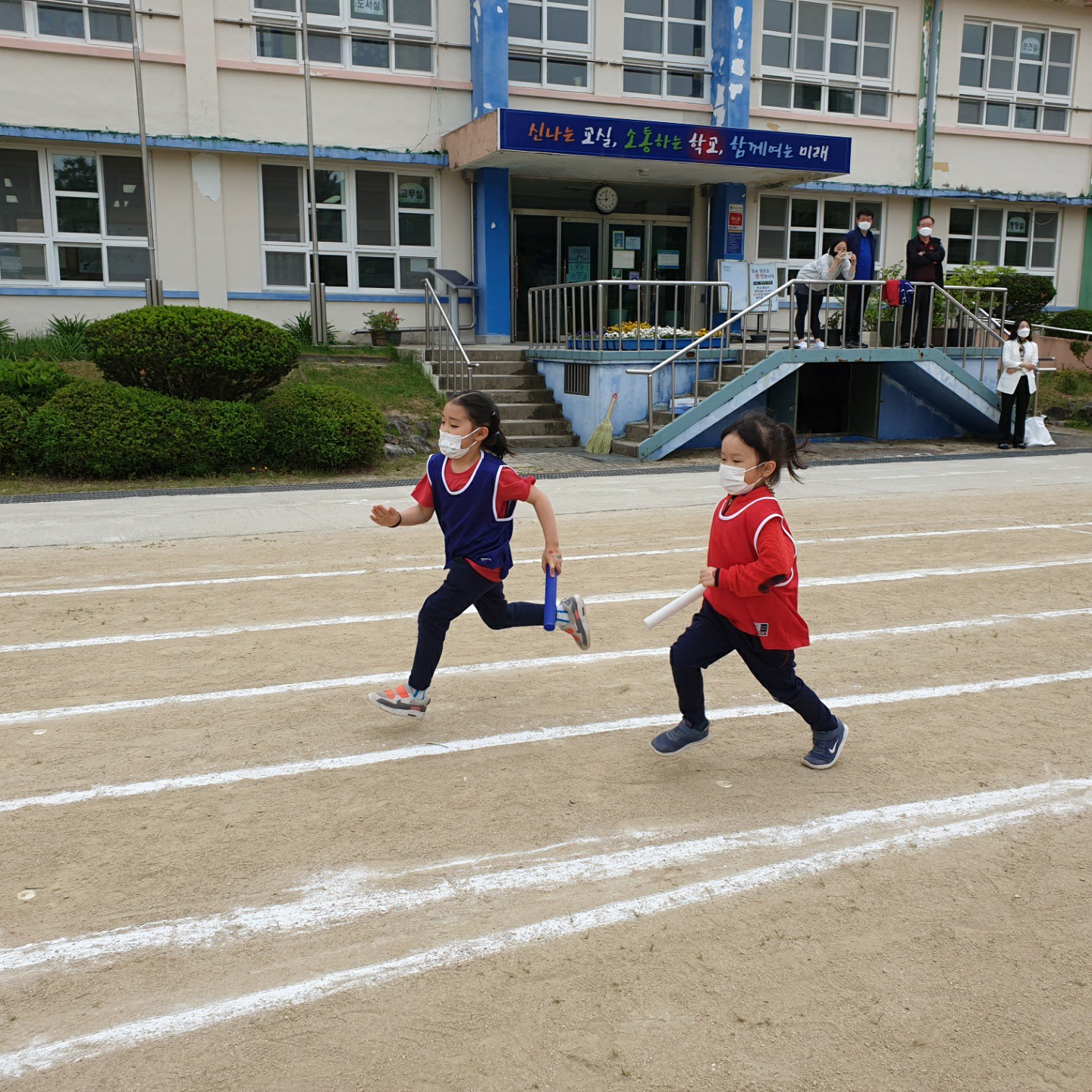 마지막 순서로 유치원을 포함한 전 학년 이어달리기는 청팀과 백팀으로 나뉜 아이들에게 평소와 다른 상기된 모습을 불러 일으겼다. 그러나 모두 열심히 하였기에 이기고 진 것에 연연하지 않아 보기 좋았다. 이렇게 동적인 활동과 정적인 활동을 골고루 하여 진행된 오늘의 놀이 한마당에서 우리 아이들이 그 동안의 지루한 일상을 벗으나 위로 받고 행복한 추억이 되었기를 기대해 본다. |