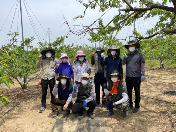복숭아 농가를 찾아 적과작업에 참여한 감천면 직원들은 서툰 농사일이지만, 구슬땀을 흘리며 최선을 다해 작업에 임하였다.