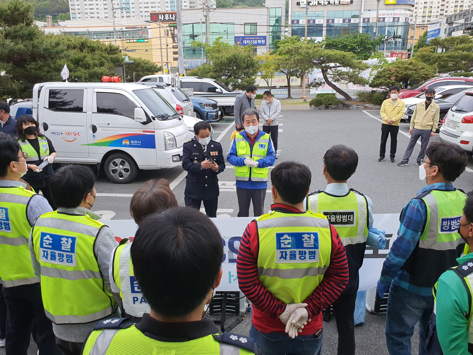 | 김천시 자율방범연합회(회장 전종만)는 5월 6일 목요일 20여명의 대원들이 모여 부곡맛고을과 문지왈 일대를 돌며 환경정비 및 코로나19 방역 활동을 실시하였다.