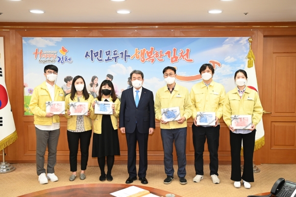 | 김천시(시장 김충섭)는 지난 5. 7(금) 직원중 출산을 앞둔 예비 부모 6명에게 출산 축하선물을 전달했다.