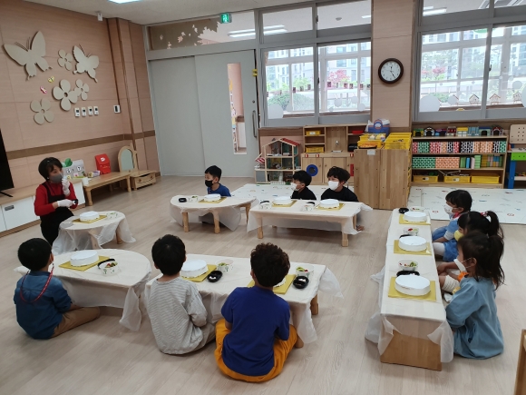 이번 활동은 코로나19 감염 예방을 위하여 유아들 간 충분한 거리두기, 활동 전후 소독과 손 씻기를 실시한 후 진행하였다.