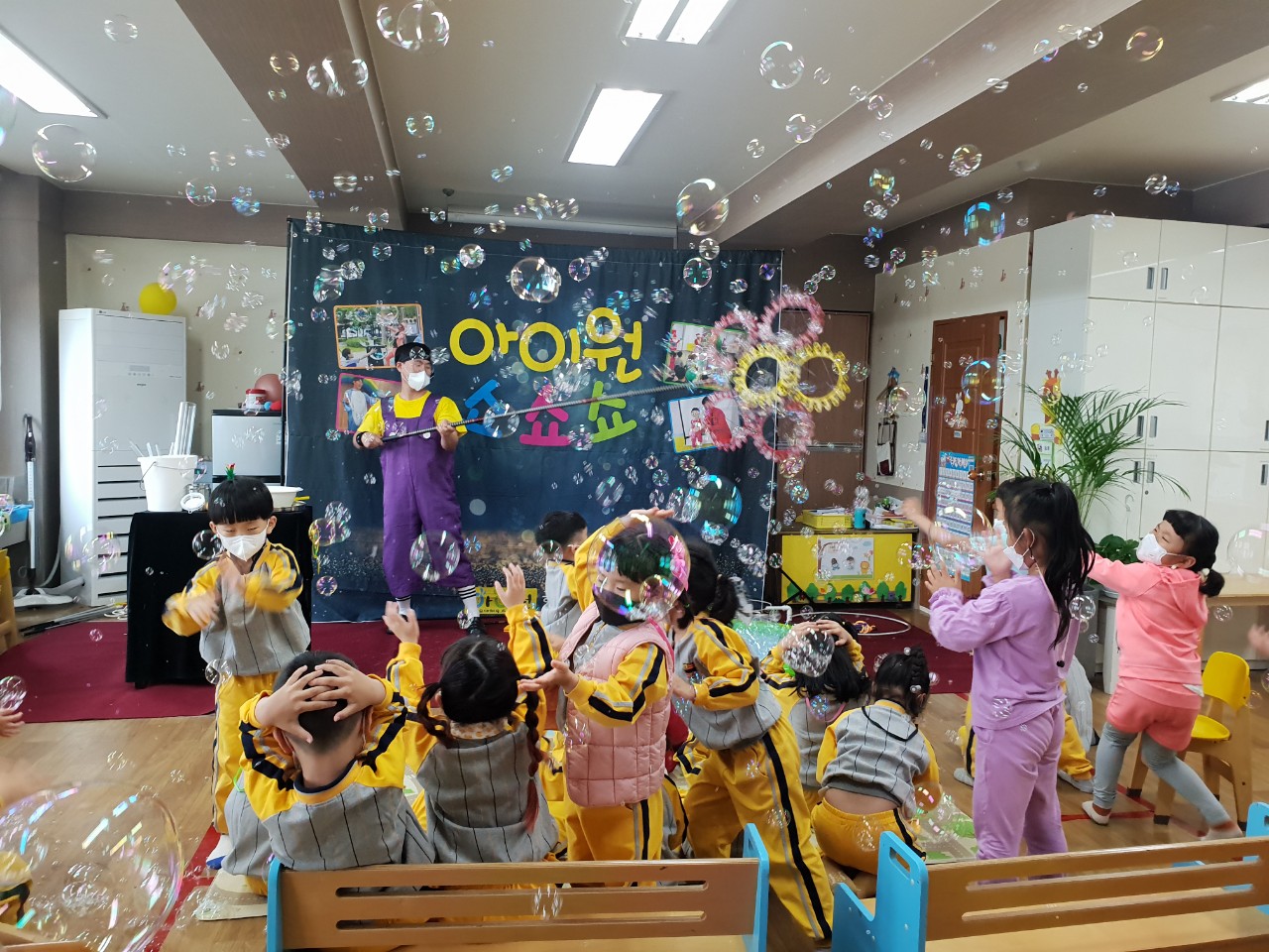 즐거운 음악과 함께 팡팡 선생님의 버블쇼가 시작되었다. 비눗방울 모양틀로 다양한 모양을 만들어서 비눗방울 놀이를 즐기기도 하고, 비눗방울 대포를 이용해서 구름빵도 만들어보았다. 아이들은 비눗방울을 만져보며 호기심 가득한 눈으로 버블쇼 공연을 감상하였다. 비가 내리는 배경음악과 함께 우산을 이용한 퍼포먼스와 비눗방울과 불을 이용한 공연에서는 아이들이 특히 큰 함성을 지르기도 하였다. 아이들은 팡팡 선생님의 재치와 재미있는 버블쇼 공연으로 웃음이 끊이지 않는 시간을 보냈다.