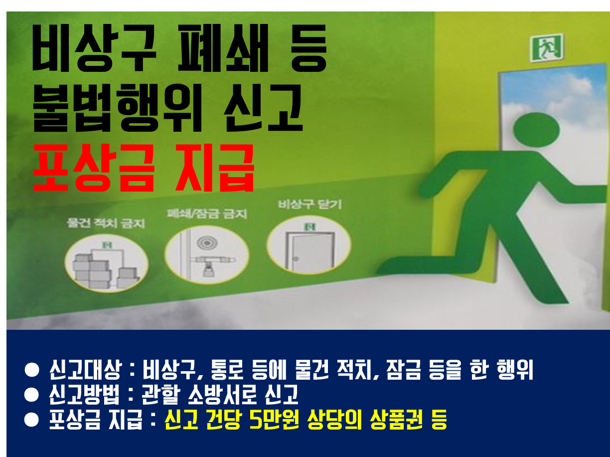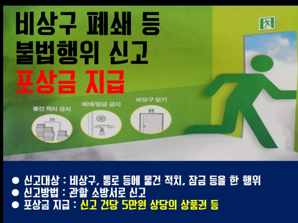 | 김천소방서는 비상구 폐쇄 등에 대한 불법행위를 신고하면 포상금을 지급하는 ‘불법행위 신고포상제’를 연중 운영한다고 밝혔다.
