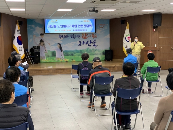 | 김천시 자산동에서는 노인일자리사업의 원활한 추진을 위해 안전간담회를 지난 11일 동 행정복지센터 2층 회의실에서 개최했다. 이날 간담회는 노인일자리사업 참여자 18명을 대상으로 코로나19 예방, 교통안전, 병해충 피해예방 등 각종 안전에 대한 교육을 실시했다. 이후 근로여건 및 애로사항에 대한 의견을 청취했다.