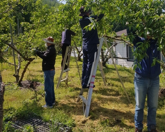 이른 아침 농가에 모인 직원들은 간단한 교육을 받은 뒤 구역을 나누어 복숭아 적과를 하였으며, 기온 30°의 이른 무더운 날씨에도 불구하고 구슬땀을 흘리며 사회적 거리를 유지한 채 묵묵히 작업에 매진하였다.