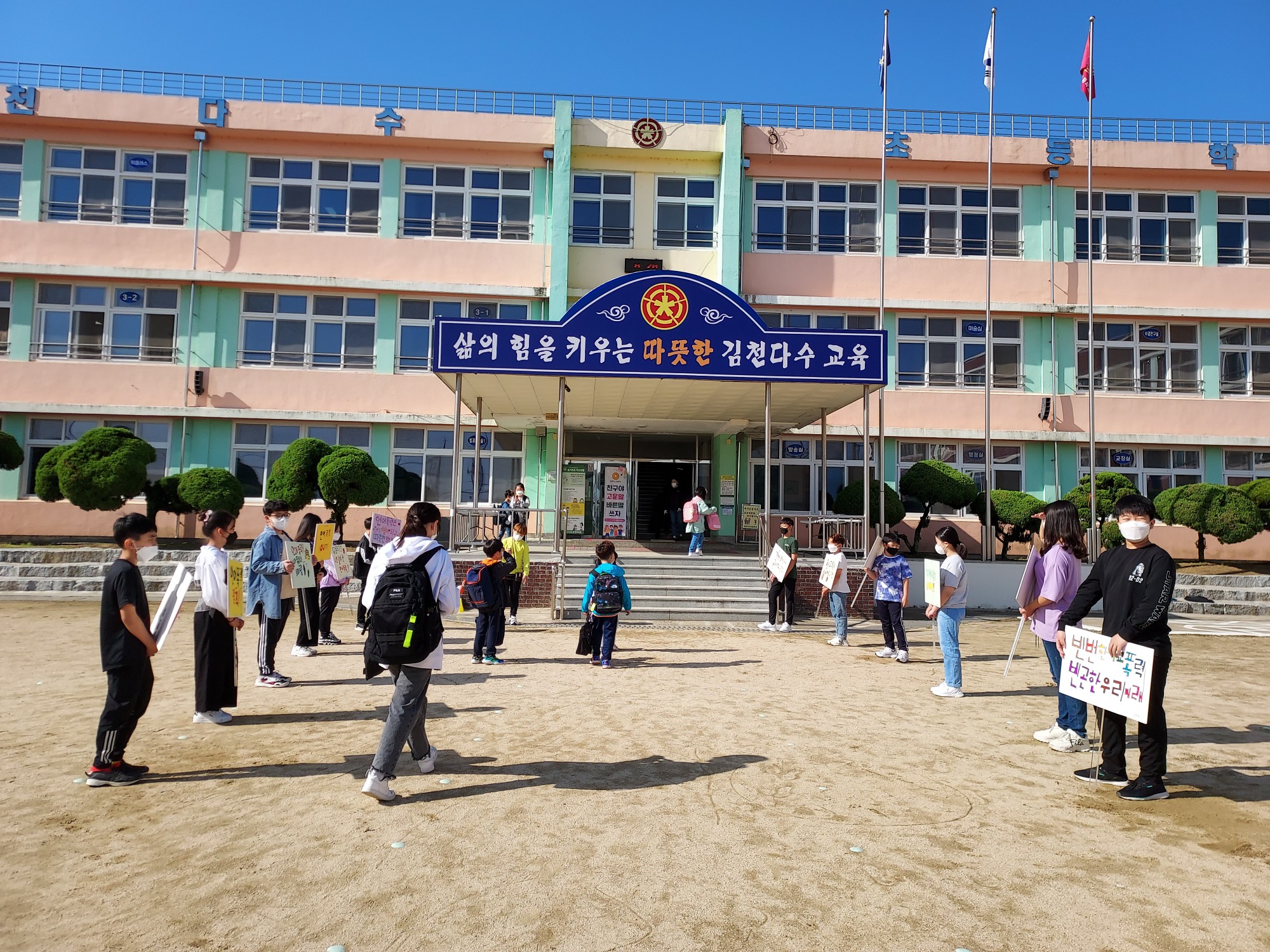 | 김천다수초등학교(교장 민병미)는 지난 5월 10일(월)부터 5월 12일(수)까지 3일간 등교 시간에 맞춰 30분간씩 언어폭력예방을 위한 캠페인을 실시하였다. 이는 전교어린이회가 주관하여 4~6학년 학급 정부회장과 전교어린이회 임원 모두 13명이 참여하였고, 학생들은 비가 오는 날씨에도 마스크를 착용하고 적극적인 자세로 임했다.
