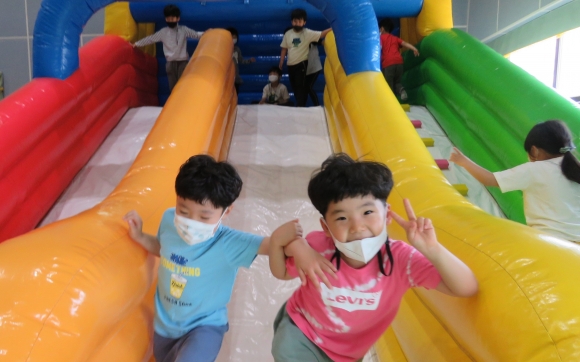 운동장에서는 바이킹, 깡통열차, 3종 스포츠 바운스 등의 다양한 놀이기구가 학생들을 맞이하였고, 강당에서는 슬라이드, 장애물바운스, 디스코팡팡 등의 놀이기구가 설치되어 학생들이 마음껏 뛰어다닐 수 있도록 하였다. 학생들이 신나게 활동하는 가운데서도 방역 수칙을 준수하며, 질서 있게 다양한 놀이기구를 이용하는 모습을 보였다.
