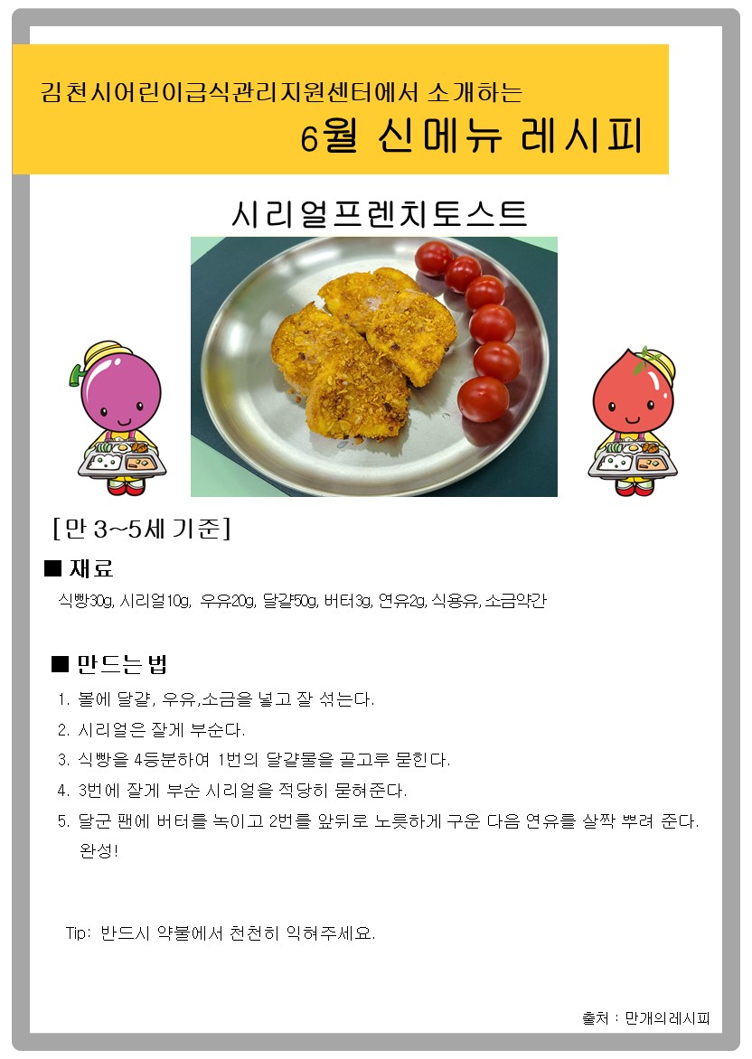 | 김천시 어린이급식관리지원센터(이사장 이창재)에서는 코로나-19로 인한 사회적 거리두기인 시기에 가정에서 활용할 수 있도록 매달 제공되는 식단의 신메뉴 레시피를 영상으로 제작하여 제공하고 있다. 이번 6월 식단의 신메뉴 레시피는 브런치 ‘시리얼프렌치토스트’ 이다.