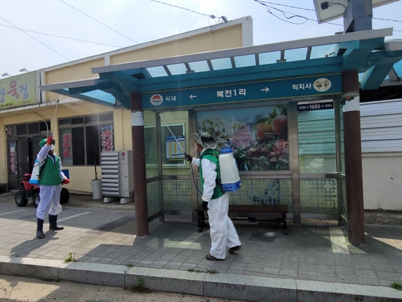 이번 방역활동은 새마을남녀협의회 회원 10명이 2개조로 조를 나누어 관내 주민 밀집지역인 면 소재지 내 버스승강장 15개소에 소독약을 살포하여 주민들이 안전하게 생활할 수 있도록 한 것이다.