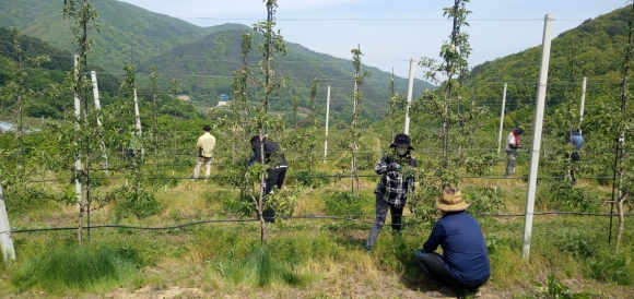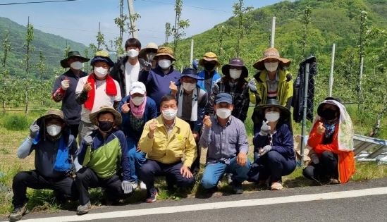 이날 농촌일손돕기는 정보기획과 직원과 더불어 20여명이 참여해 사과 알솎기 작업을 도왔으며, 코로나19 감염 예방을 위해 마스크 상시 착용, 사회적 거리두기 실천 등 방역지침을 철저히 지키면서 작업을 진행하였다.
