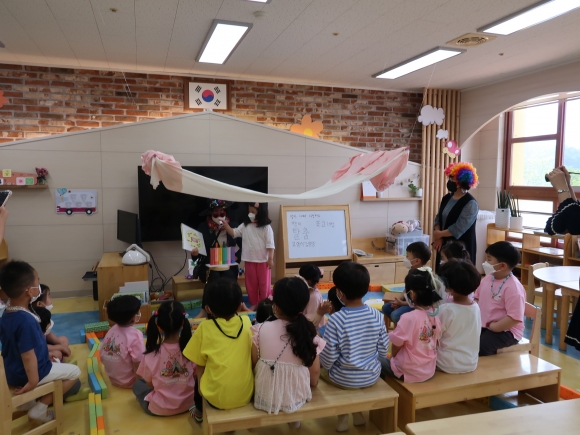 각 교실에서 이루어진 ‘행복이벤트’무지개 가발과 하트 선글라스, 반짝이 모자를 착용한 원장, 원감이 수업 중인 각 교실에서 유아들에게 스승의 날의 의미를 설명하였다. 그리고 교사를 위해 준비한 깜짝 선물을 유아가 뽑아 담임교사에게 전달하는 ‘사랑의 쿠폰 뽑기’ 놀이를 진행하였다. 유아들은 우스꽝스러운 모습에 좋아했고, 교사들은 생각지도 못한 이벤트에 많은 위로와 감동을 받았다고 하였다. 장옥남 원장은 유아에게 행복한 웃음을 전하고, 교사들을 위로하고자 벌인 이번 행사를 통해 김천 유치원 교육가족 모두가 행복한 스승의 날이 되기를 바란다고 하였다. |