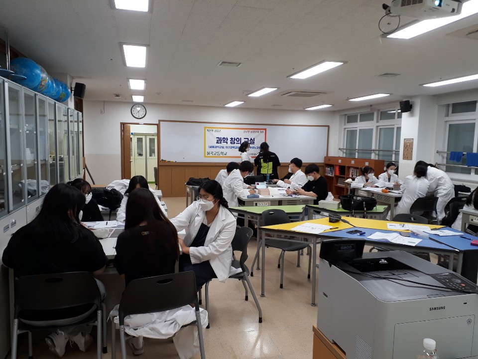 | 율곡고등학교(경북 김천시, 교장 남득술)에서는 2021년 5월 10일(월)부터 13일(목) 18시 30분 이후의 방과후 시간을 활용하여 과학창의교실을 운영하였다. 학생의 희망에 따라 아두이노 기반 IOT교육 및 전자회로 탐구교실 10명, 생명과학 및 MBL 지구과학 10명, 스마트기반 MBL창의융합교실(화학+생명과학) 21명의 3개의 분야 총 41명의 학생, 2명의 관리 교사, 6명의 강사가 행사에 참가하였다. 율곡고등학교 과학과에서는 긴 시간 연속적으로 활동을 해야 하는 아두이노나 MBL활용수업의 특성상 평소 수업 시간에 실시하기 어렵지만, 학생들의 탐구역량 향상에는 큰 도움이 된다는 것을 인식하고 2020학년도부터 야간을 활용한 창의교실 형태로 운영하고 있다.