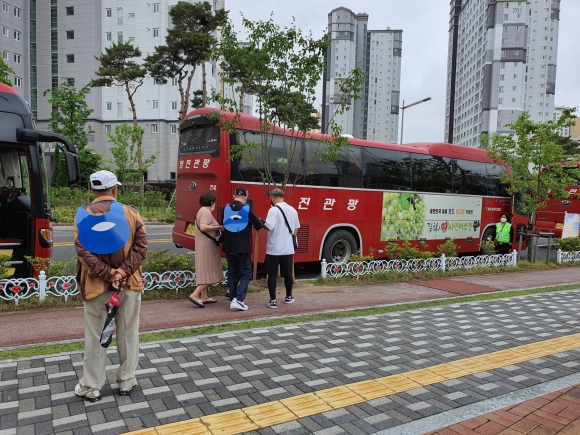 율곡동행정복지센터에서는 예진표를 접종대상자에게 사전에 배부해 접종당일 작성해서 오도록 안내하여 접종센터에서 지연되지 않도록 하고, 각 버스마다 빨강, 파랑, 노랑, 초록의 종이모자와 개인별 명찰을 착용하도록 하여 어르신들이 타 읍면동과 버스를 혼동하지 않도록 인솔의 묘를 구했다.