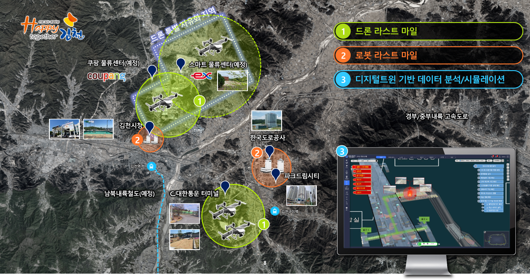 김천시는 그간 약 300억 규모의 드론 실기시험장 구축, 드론 특별 자유화 구역 선정 등 다양한 드론관련 국책사업을 관내 유치하여 착실하게 미래산업 육성에 대비해 왔다. 더불어 이번 사업선정을 위해 지자체(김천시, 경북도)뿐만 아니라 다양한 기업과 연구기관(경북IT융합산업기술원, SK플래닛, 트위니, 니나노컴퍼니, 나르마, SK텔레콤, 메쉬코리아, CJ대한통운, 한국도로공사, 영남대학교)이 참여하여 김천시 사업에 대한 높은 관심을 보인 점도 선정에 긍정적인 영향을 미친 것으로 알려졌다. 이번 김천시 사업은 크게 드론 실증과 자율주행 로봇 실증, 빅데이터 시스템 구축 크게 3가지로 구성된다. 드론을 활용하여 김천시청과 농소면 일원에서 배달하는 ‘라스트마일 드론 서비스’는 상대적으로 거리가 먼 비도심지역 배송을 맡아 택배 노동자들의 부담을 덜어줄 것으로 예상되며 ‘자율주행 로봇’은 실내 물류 배송을 맡아 배달 및 택배 노동자의 이동 시간 절감에 기여할 것으로 기대된다. 이러한 물류 서비스를 데이터를 저장하여 최적의 이동경로 등을 구현할 ‘빅데이터 및 디지털 트윈 시뮬레이션’역시 물류 첨단화에 기여하여 김천시가 4차산업 중심도시에 걸맞은 위상을 확보하는데 도움이 될 것이다.