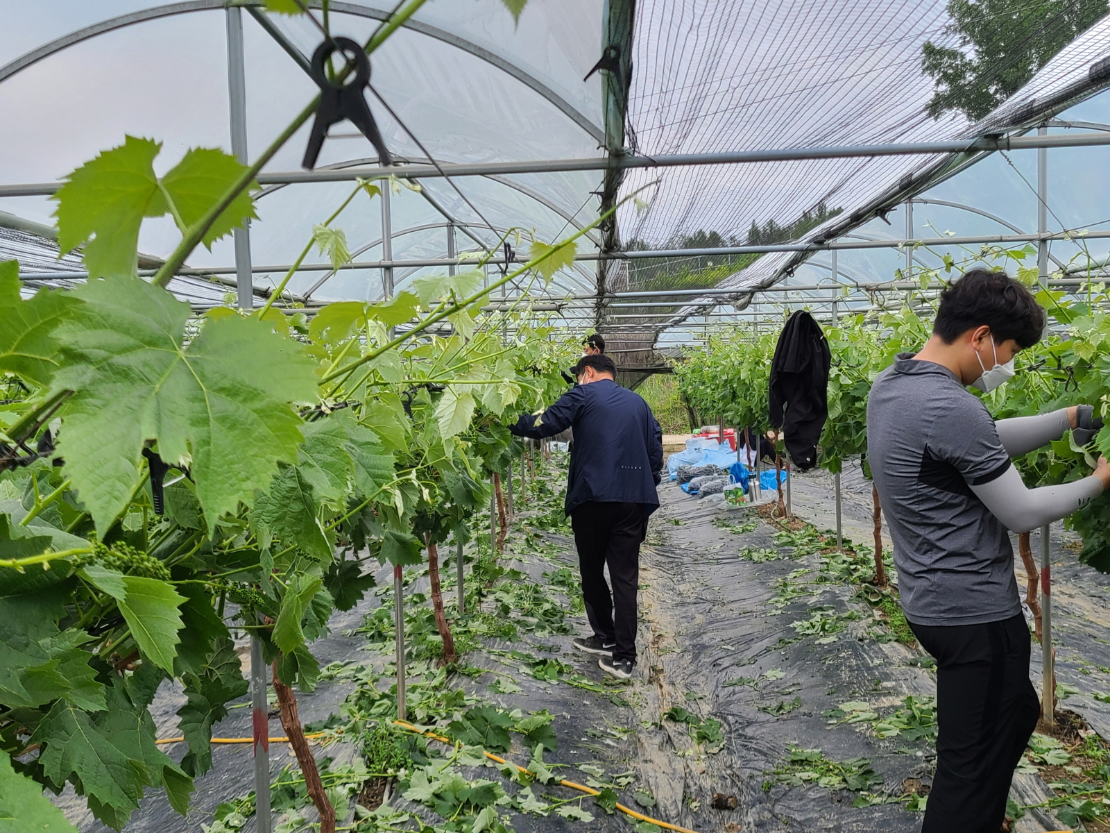 투자유치과 직원들은 이른 아침부터 어모면의 한 포도 재배 농가를 방문하여 서툰 솜씨지만 포도 순따기 작업을 도우며 우리 농촌의 힘든 현실에 대해 다 같이 공감하는 시간을 가졌다.