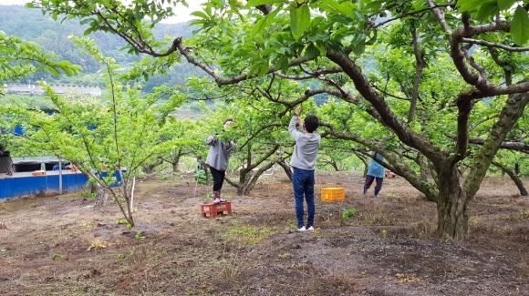| 지례면(면장 송재용)은 지난 20일 농번기를 맞아 코로나19로 인해 일손부족으로 어려움을 겪는 지역 농가를 방문해 자두 적과 작업을 가졌다.