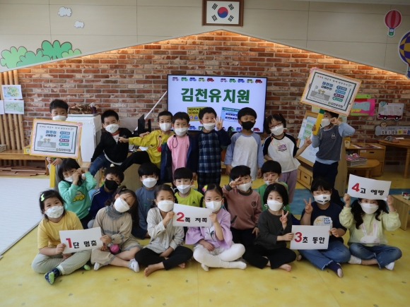 김천유치원 햇살반 유아들은 교통안전 슬로건을 들고 각반 교실을 돌아다니며 교통안전에 대한 중요성을 알렸다. 교통안전 슬로건은 ‘어린이 보호구역 1단 멈춤!(일단 멈추기) 2쪽 저쪽!(양쪽을 자세히 살피기) 3초동안!(잠깐 대기하기) 4고 예방(습관 기르기)’이다.