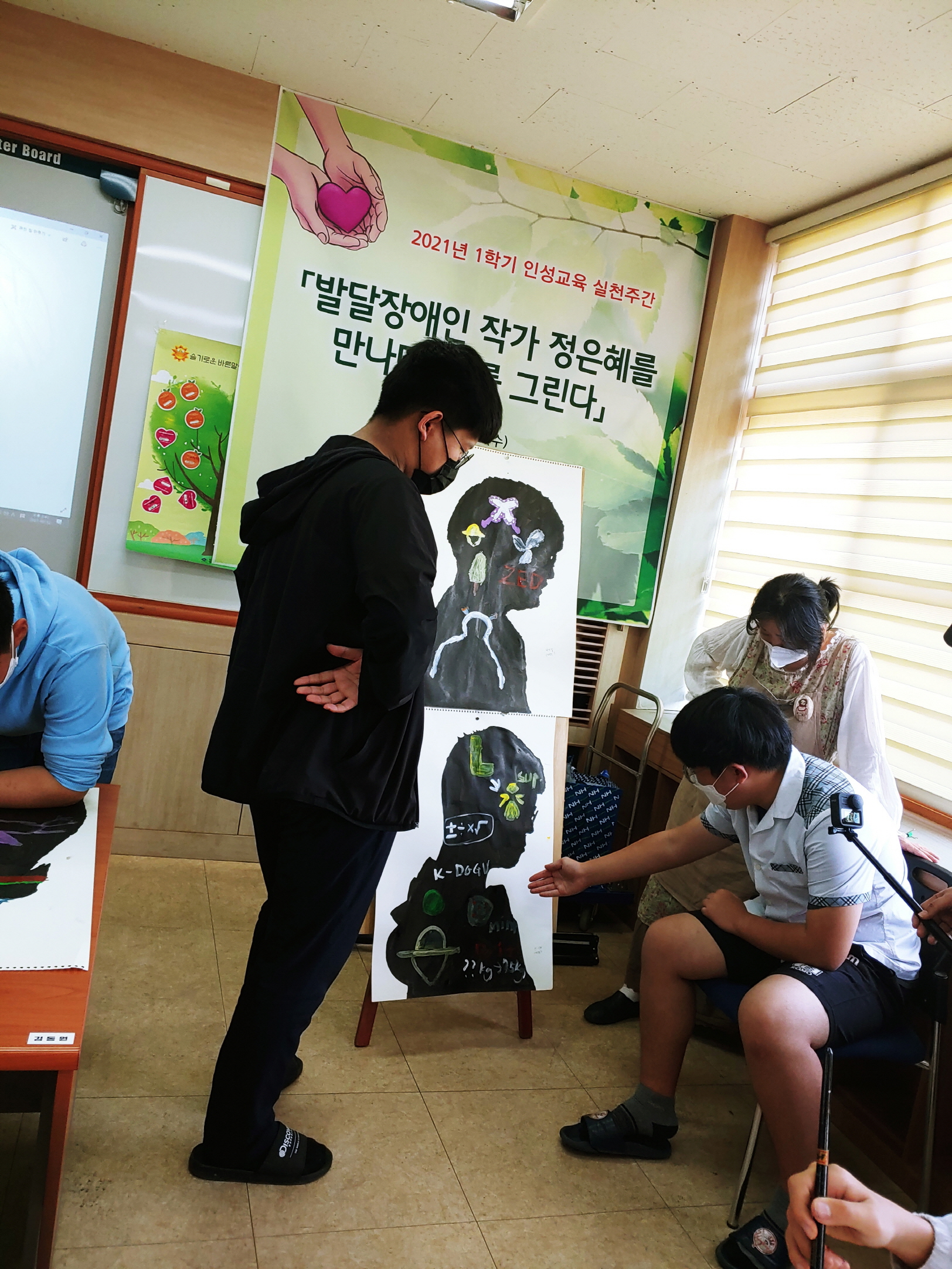 | 어모중학교(교장 정천상)에서는 인성교육 실천주간을 맞이하여 5월 12일(수), 『발달장애인 정은혜 작가와 함께 만나다, 너를 그린다』프로그램을 실시하였다.