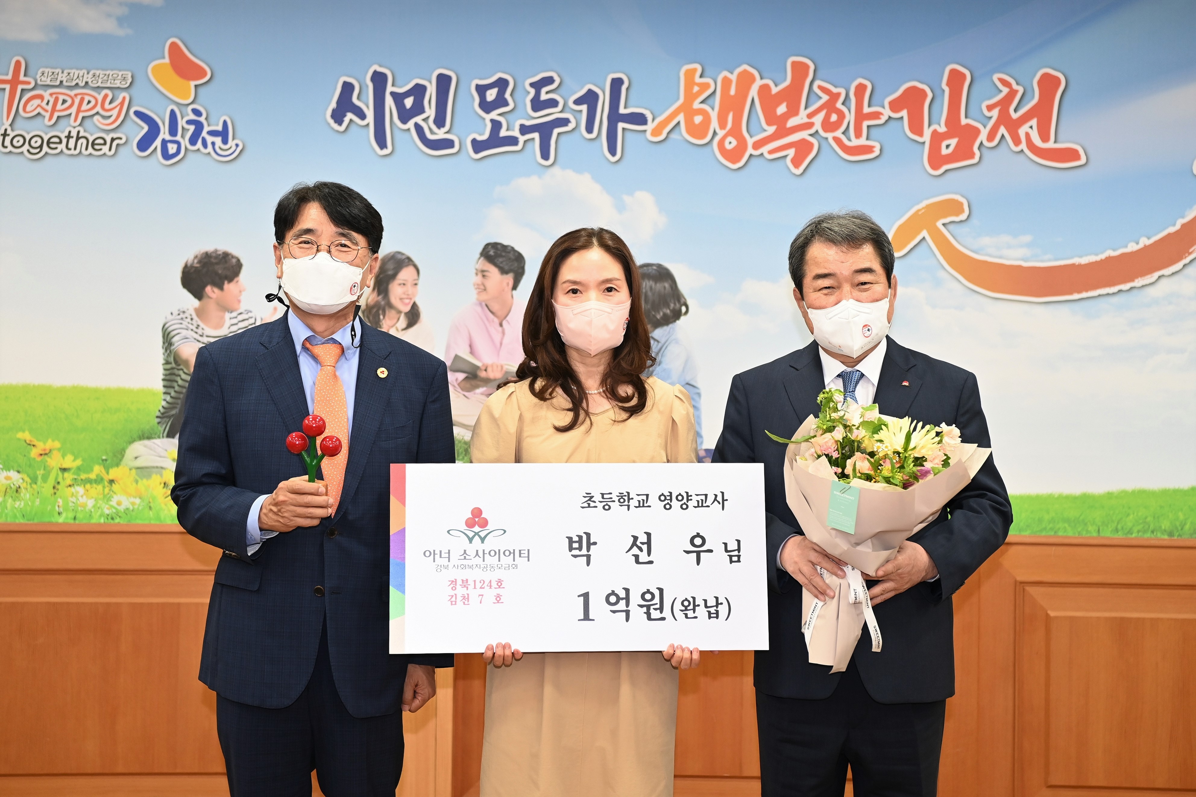 | 5월 24일, 김천시청에서 박선우 초등학교 영양교사, 전우헌 경북사회복지공동모금회장, 김충섭 김천시장, 김무영 ㈜엠텍 대표(김천시 1호 아너), 박유순 김천시 사랑의 열매 봉사단장 및 관계자들이 참석하여 신규 아너소사이어티 회원 가입식을 가졌다.