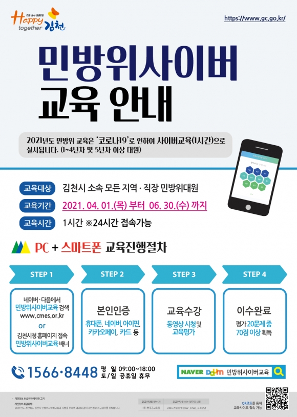 | 김천시(시장 김충섭)는 코로나19 감염 확산 방지를 위해 기존 5년차 이상에만 한정해서 실시하던 사이버 교육을 2021년도에는 1~4년차 대원까지 포함한 전 민방위 대원을 대상으로 확대 실시하고 있다. 즉, 1~4년차 민방위대원의 집합교육(4시간) 및 5년차 이상 민방위대원의 사이버교육 또는 비상소집훈련을 전부 사이버교육(1시간)으로 대체한 것이다.