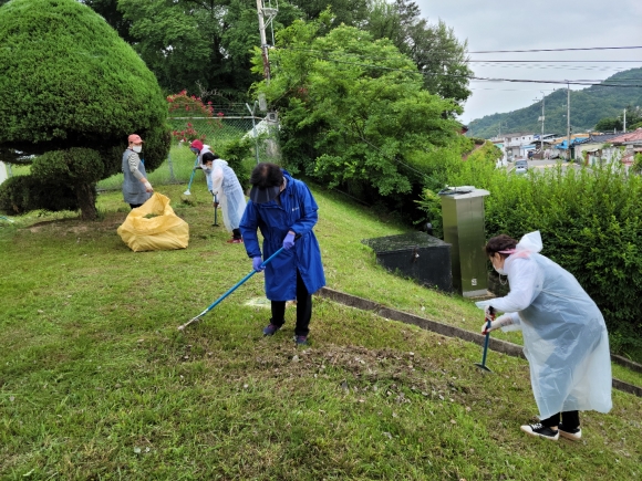 비가 내리는 굳은 날씨에도 불구하고 읍면동분회장, 여성회 등 회원 20여 명이 참여하여 위령비 광장의 풀을 뽑고 주위를 정리했다.