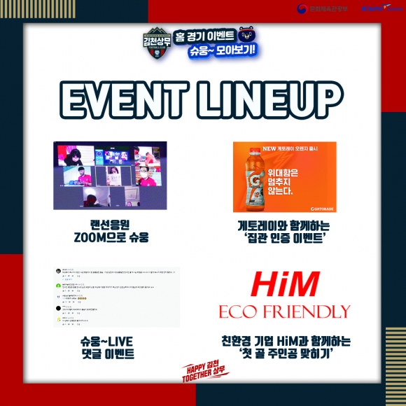 김천상무는 랜선응원 ZOOM으로 슈웅 이벤트를 진행한다. 오는 29일(토)까지 네이버 폼을 통해 사전 신청한 후 경기 당일 카카오톡 단체 채팅방을 통해 응원 입장 링크를 수령 받으면 된다. 경기장 내 아나운서와 실시간으로 소통하며 zoom을 통해 김천상무를 응원하면 된다. 참가자 5명을 선정해 슈웅 인형을 증정한다.