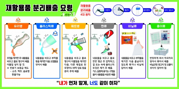김천시는 세척되지 않은 배달 용기, 온라인쇼핑으로 인한 택배 상자 등이 재활용품과 섞이지 않도록 ‘비운다, 헹군다, 분리한다, 섞지 않는다’라는 4대 원칙을 반드시 지켜 종량제 쓰레기를 줄이고 재활용률도 높일 수 있도록 하여야 한다고 설명했다.