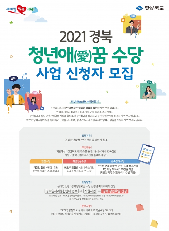| 경북도는 6월부터 적극적으로 구직․근로 활동하는 청년들을 위한 지원정책인 ‘청년애(愛)꿈 수당’을 본격적으로 시행한다.