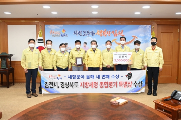 | 김천시(시장 김충섭) 세정과는 경상북도에서 주관하는 지방세정 종합평가에서 특별상을 수상하였다. 올해 초 행정안전부 주관 세외수입 운영평가 최우수상 수상, 경상북도 주관 체납세 징수평가 최우수상 수상에 이어 세 번째 수상으로 김천시는 세정분야 평가에 있어 타시군에 비해 확고한 입지를 다지게 되었다.