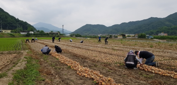 이번 일손돕기는 코로나 19가 장기화되고 있는 상황에서 양파 수확 시기에 들어선 양파 농가주의 인력난, 인건비 상승, 코로나 19 감염에 대한 걱정 및 우려까지 삼중고를 겪고 있는 양파 농가주에게 조금이나마 도움을 주기 위해 도로철도과 직원 14명은 이른 아침부터 지례면에 있는 농가를 방문해 마스크를 착용하고, 사회적 거리두기 지침을 준수한 가운데 비닐걷기, 양파대 자르기, 양파캐기 등 양파 수확에 팔을 걷어붙였다.