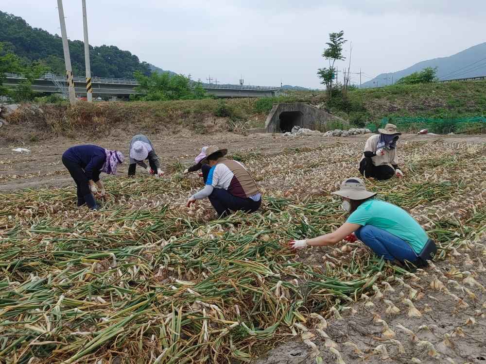 | 김천시 율곡동행정복지센터(동장 이우문)에서는 14일 양파 수확철인 6월을 맞아 일손 부족으로 어려움을 겪고 있는 지례면의 한 농가를 찾아 일손 돕기에 나섰다.