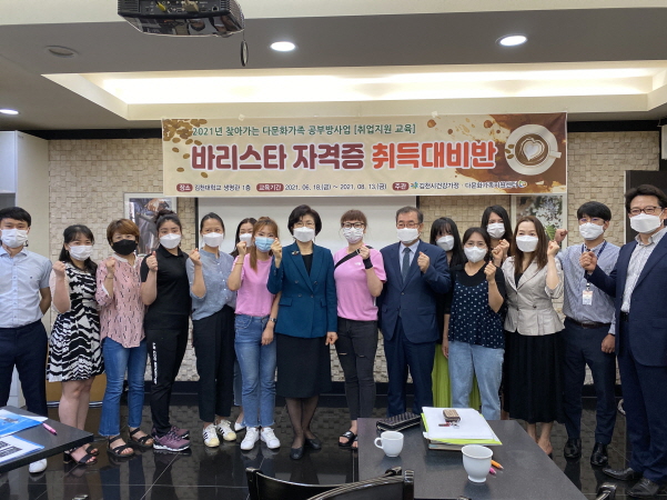 이론과 실습을 김천대 김홍길교수(항공호텔전공)가 담당하며, 바리스타 자격증 취득반 프로그램은 무료교육으로 김천시 건강가정‧다문화지원센터에서 지원받아 다문화 결혼이주여성을 대상으로 6월 18일 개강식을 시작으로 매주 금요일 주 1회 3시간씩 총 9주 27시간(이론,실습 포함)을 바리스타 자격증 취득반 프로그램이다.