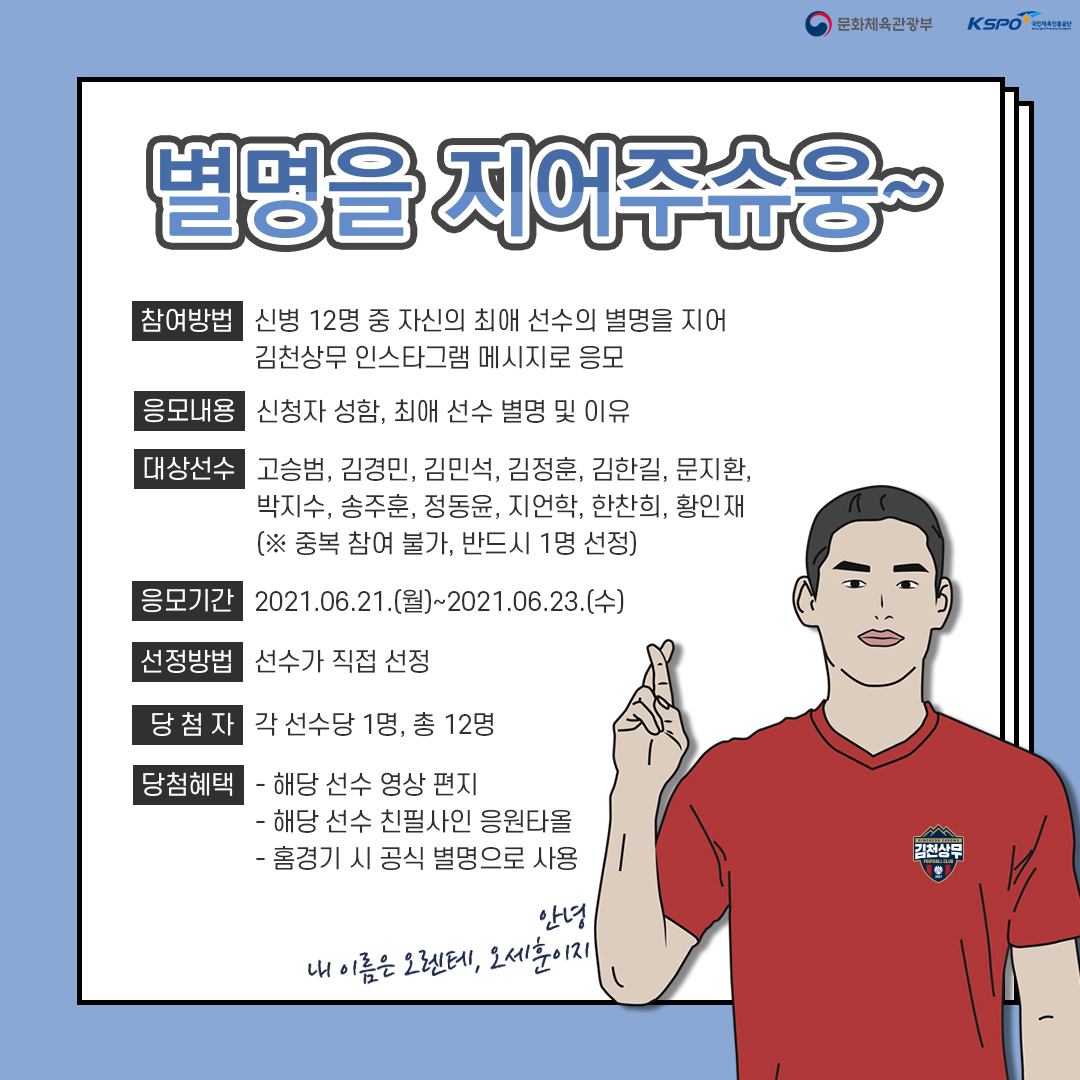 신병 12명 중 최애 선수 한 명을 정해 김천상무 인스타그램 메시지로 신청자 이름, 선수 별명과 간단한 이유를 보내면 참여가 완료된다. 중복 참여는 불가하며 한 명의 선수를 정해 별명과 이유를 응모해야 한다.