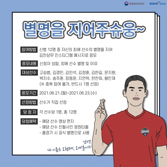 | 김천상무프로축구단이 신병 선수들의 입대에 맞춰 별명 짓기 이벤트를 실시한다.