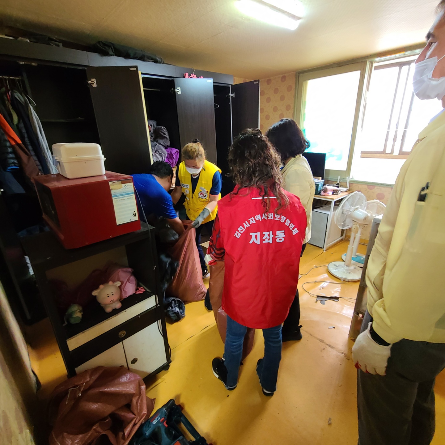 이번 주거환경 개선 봉사에 참여한 단체는 지좌동 지역사회보장협의체, 대한적십자 김천봉사단, 김천시종합자원봉사센터, 공무원 등 30여명이 참여하여 18일, 19일 이틀간 대청소·폐기물 처리 및 도배·장판 봉사로 대대적인 환경 정비와 초록우산 어린이재단에서 수도관 교체 공사 및 새 가구(장롱 및 아이들 책상) 지원을 받아 보다 깨끗하고 쾌적한 환경으로 탈바꿈되었다.