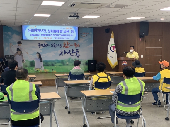| 김천시 자산동에서는 자활근로사업, 장애인일자리사업 및 자원관리도우미사업의 원활한 추진을 위해 산업안전보건교육 및 성희롱예방교육 등을 지난 21일 동 행정복지센터 2층 회의실에서 개최했다.