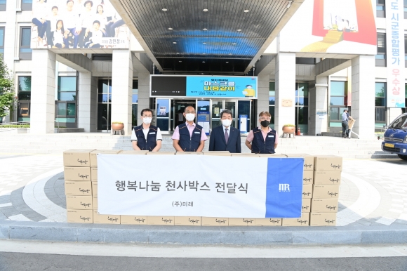 | 주식회사 미래(대표 김근하, 최기태)는 지난 22일 김천시청을 찾아 어려운 이웃에게 전해달라며 천사박스 100세트(300만원 상당)를 전달했다.