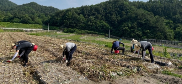 | 김천시청 기획예산실 직원들은 22일 무더운 날씨에도 양파 수확철을 맞아 인력부족 및 잦은 우천으로 양파 수확작업이 지연된 부항면 농가에 적기에 양파 수확이 될 수 있도록 아침 일찍부터 일손 돕기에 두 팔을 걷어붙였다.