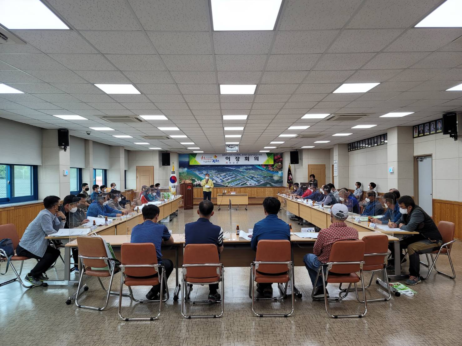 이번 이장회의는 코로나19 예방을 위한 손 소독, 마스크착용, 발열체크, 칸막이 설치 등 방역수칙을 준수하며 진행됐으며, 현안사항인 사회적 거리두기 1단계 안내, 경로당 개방 알림 및 운영 협조, 과수화상병 사전방제조치 이행 행정명령 홍보 등을 전달하였다.