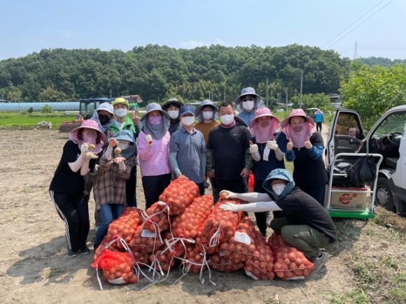 이날 더운 날씨에도 코로나19 방역수칙에 따른 마스크 착용, 개인 간 거리두기 등을 준수하며 양파 수확 작업을 하였다.