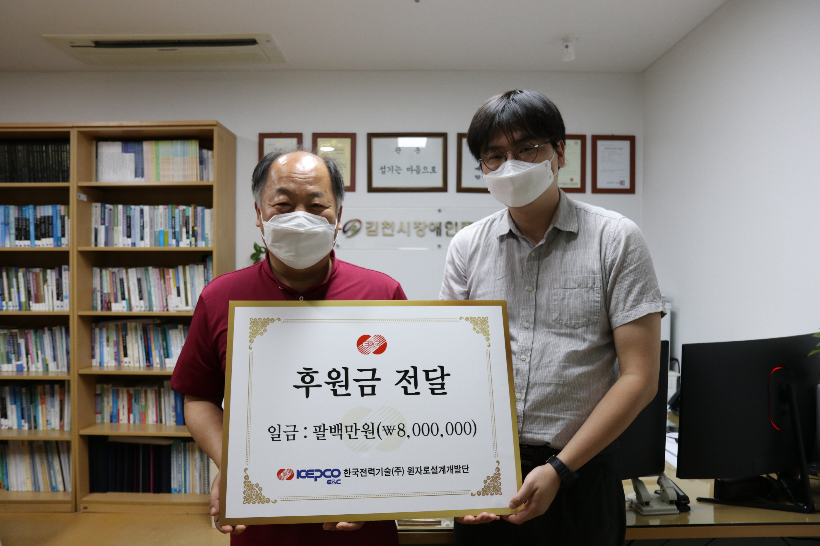 전달식은 코로나19 확산 방지를 위해 간소하게 진행되었으며 원자로 설계개발단 원자로사업관리실 배광진 팀장과 권정애 차장이 함께했다. 후원금은 재가장애인의 올바른 식생활 확립을 위해 주1회 50가정 대상으로 3찬을 배달해 드리는 밑반찬 지원사업에 사용될 예정이다.