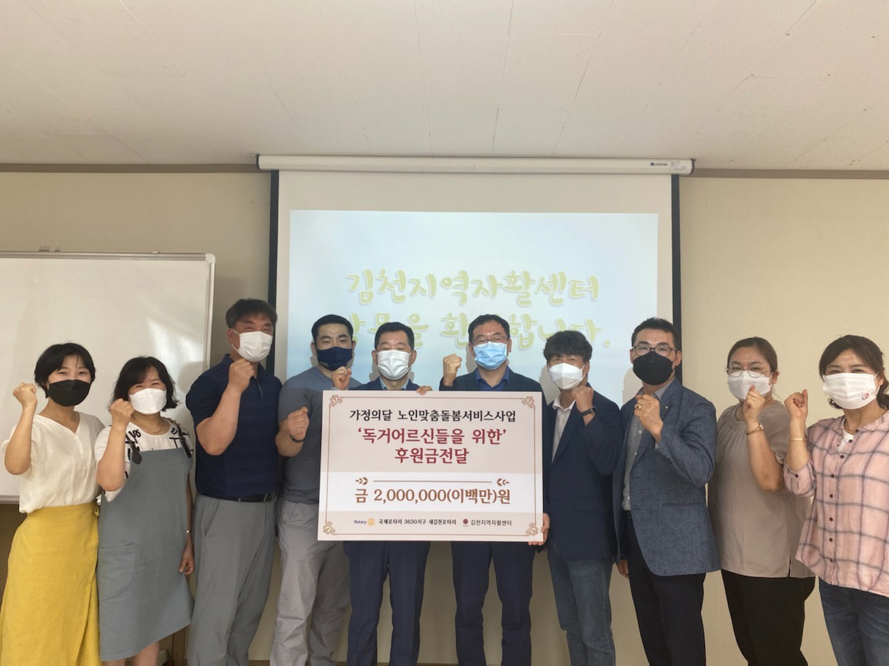 | 김천지역자활센터(관장 한상호)에서는 지난 6월 29일 노인맞춤돌봄서비스 어르신 후원연계사업의 일환으로 국제로타리 3630지구 새김천로타리 클럽의 후원금 2백만원을 전달받는 행사를 가졌다.